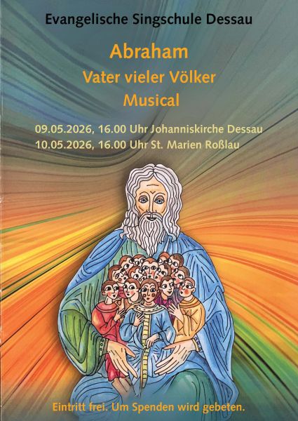 Herzlich laden wir zu dem Musical "Abraham - Vater vieler Völker" derEvangelischen Singschule Dessau unter der Leitung von Kantorin Charlotte Schubert am 10. Mai - 16.00 Uhr - in die St. Marienkirche Roßlau ein.