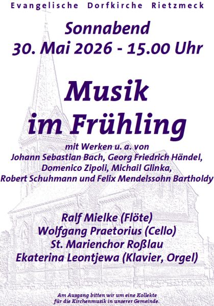 Zu einem Konzert im Frühling mit anschließendem Kaffee wird am 30. Mai um 15 Uhr in die Rietzmecker Dorfkirche eingeladen. Werke von Johann Sebastian Bach, Jochann Kaspar von Kerll, Georg Friedrich Händel, Domenico Zipoli, Michail Glinka, Robert Schumann, David Plüss, Felix Mendelssohn Bartholdy und Louis Lefebure-Weli kommen zur Aufführung. Ralf Mielke (Flöte), Wolfgang Praetorius (Cello), der St. Marienchor Roßlau und Ekaterina Leontjewa (Klavier, Orgel) gestalten das Konzert.