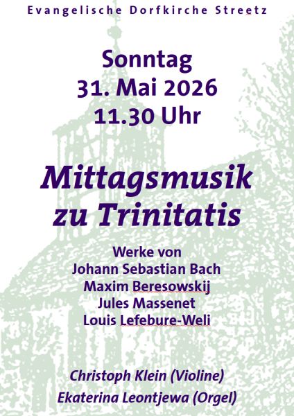 Zum Trinitatisfest laden wir herzlich zum Zentralgottesdienst in die Streetzer Kirche ein. Nach dem Gottesdienst wird zum Frühschoppen eingeladen. Um 11.30 Uhr schließt sich die „Mittagsmusik zum Trinitatisfest“ an. Werke von Johann Sebastian Bach, Maxim Beresowskij, Jules Massenet und Louis Lefebure-Weli werden zu hören sein. Christoph Klein (Violine) und Ekaterina Leontjewa (Orgel) gestalten die Mittagsmusik.